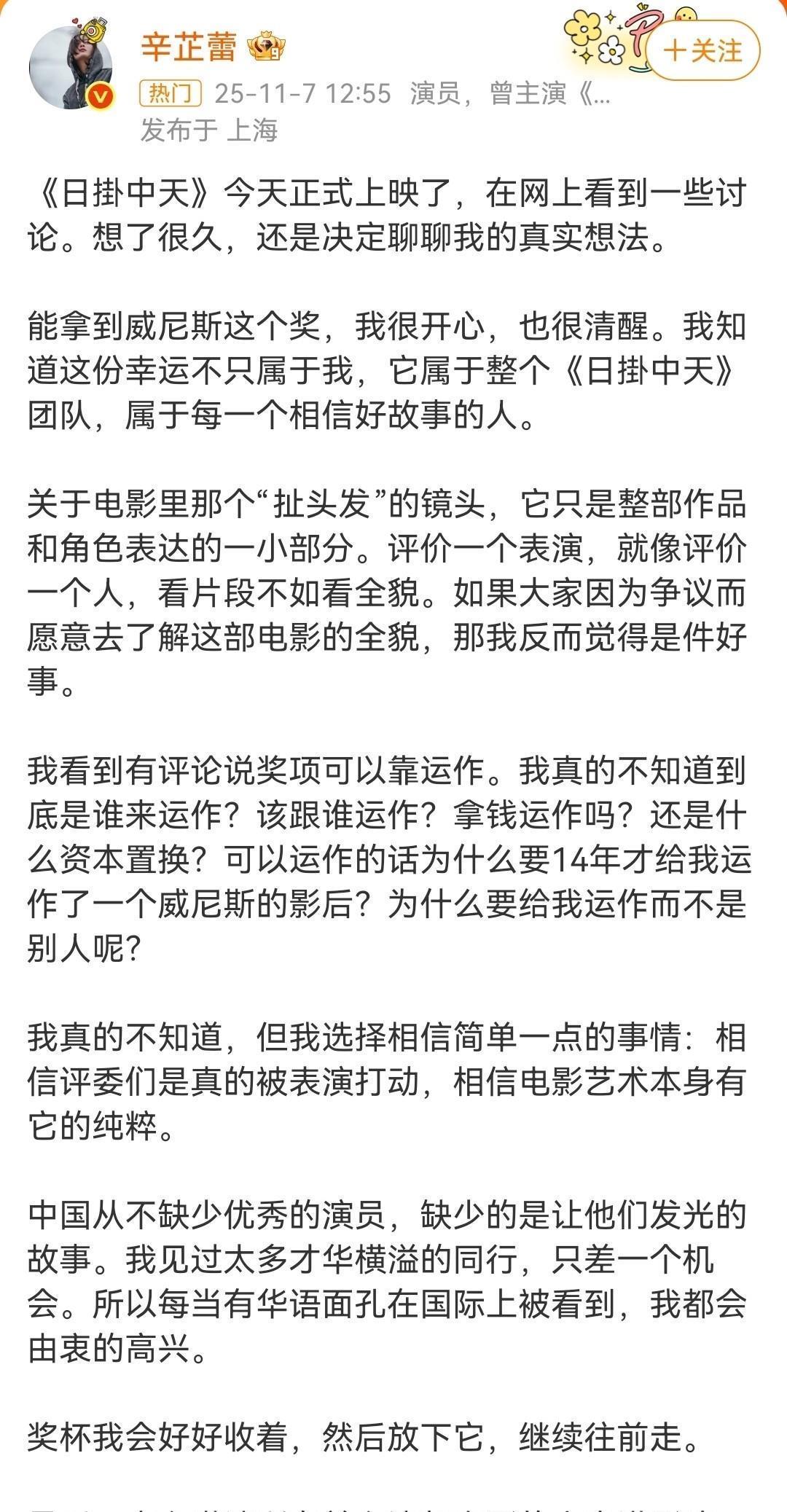 前脚刚在威尼斯风光摘得“最佳女演员”,后脚就被推上舆论的风口浪尖——